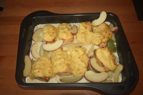Eier trennen. Kartoffeln durchdrücken und mit Butter, Eigelben und gehacktem Dill verrühren. Eiweiss mit 1 Prise Salz steif schlagen und unter die Kartoffelmasse heben. Masse auf dem Lachs verteilen, im Ofen 15 MInuten überbacken. Ca. 5 Minuten vor Garzeitende Apfelspalten zum Lauch geben, nach Wunsch mit Dill garnieren.