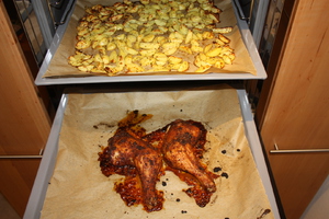 Die Kartoffeln auf dem zweiten Blech verteilen und zu den Hähnchenschlegel in den Backofen schieben und weitere 25 - 30 Minuten garen.