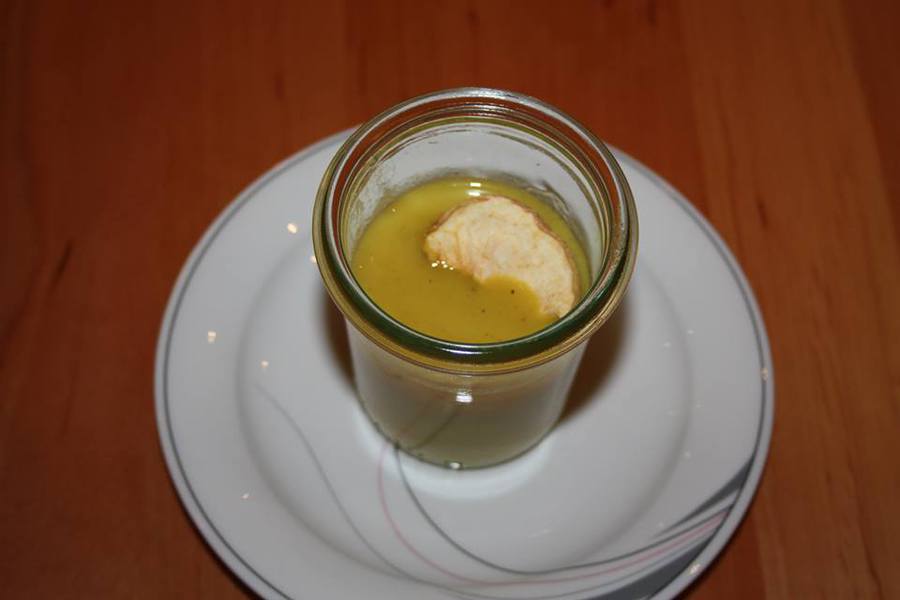 Äpfel schälen, vierteln, Kerngehäuse entfernen und in Stücke schneiden, mit Zitronensaft beträufeln Zwiebeln und Knoblauch fein schneiden Äpfel, Zwiebel und Knoblauch in heisser Butter dünsten Kartoffeln, in Würfel geschnitten mitdünsten Currypulver darüber stäuben, kurz mitdünsten mit saurem Most und Bouillon ablöschen 30 Minuten köcheln lassen. Dann mit dem Stabmixer pürieren.